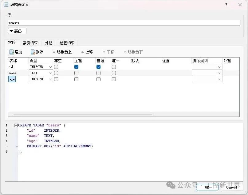 • 如果你希望 id 字段能自动递增(即每次插入一条新数据,id 会自动加 1),可以勾选 “自增”(在 id 那一行)。
