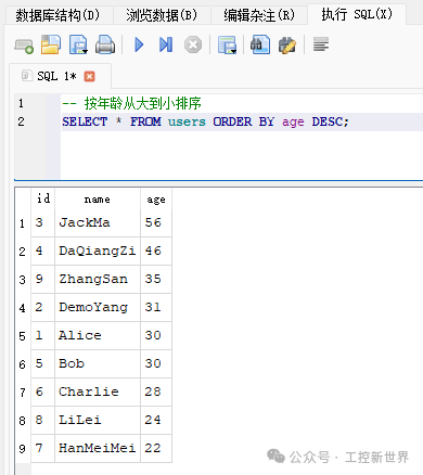 按照 age 字段进行排序,DESC 表示 降序排列(从大到小)。