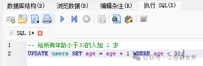-- 给所有年龄小于30的人加 1 岁