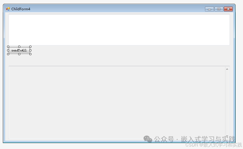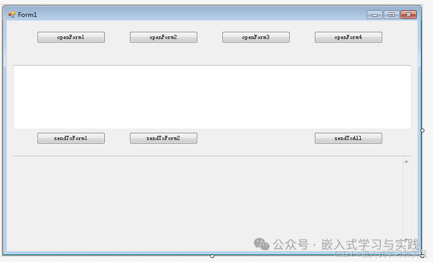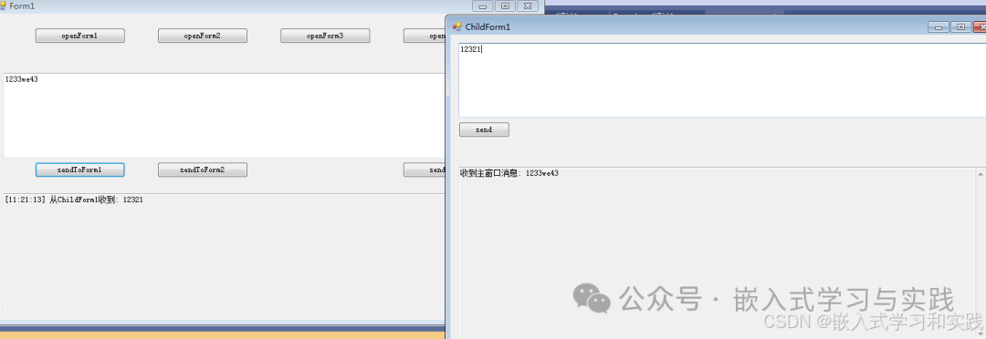 using System;using System.Collections.Generic;using System.ComponentModel;using System.Data;using System.Drawing;using System.Linq;using System.Text;using System.Threading.Tasks;using System.Windows.Forms;namespace MultiWindowCommunication.Forms{    public partial class ChildForm2 : Form    {                public event EventHandler<string> SendMessageToMain;        public ChildForm2()        {            InitializeComponent();        }                public void ReceiveMessage(string message)        {            txtReceived.Text = $"收到主窗口消息: {message}";        }        private void btnSendToMain_Click(object sender, EventArgs e)        {            if (!string.IsNullOrEmpty(txtMessage.Text))            {                                SendMessageToMain?.Invoke(this, txtMessage.Text);                txtMessage.Clear();            }        }    }}