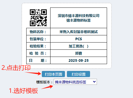 3.点击”打印标签“后,进入到打印页面内,先选好模板,然后点击"打印本页面"。