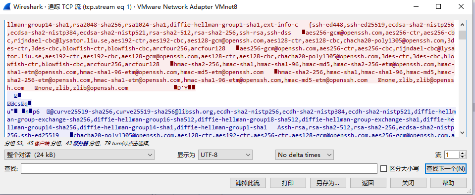 在任何一个 SSH: Encrypted packet 或 SSH: Channel Data 数据包上右键,选择 Follow -> TCP Stream