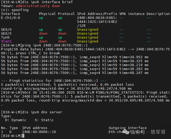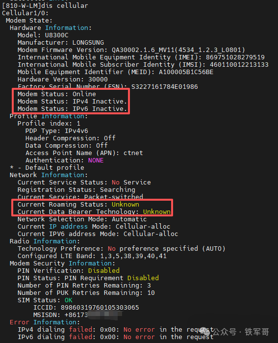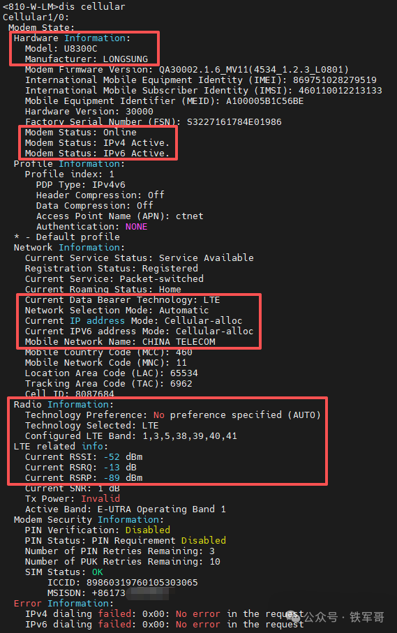 可以看到LTE模块的硬件信息、状态、网络信息等等,因为我使用的是电信的手机卡,显示的运营商信息就是CHINA TELECOM。在Radio无线电通信信息中,显示当前选择的网络是LTE,配置的LTE频段为1,3,5,38,39,40,41,其中B1/B3对应的是联通和电信的LTE-FDD,B5对应的是电信的LTE-FDD,B38/B39/B40/B41对应的是移动的LTE-TDD,确认是全网通无疑了。 在LTE网络相关信息中,当前信号质量Current RSSI的取值范围为-110dBm到-51dBm,我们现在的-52 dBm基本上算是满格信号了;相同环境下,手机终端的信号强度显示仅有-93 dBm,说明这个天线的作用还是很大的。 如果配置了ipv6 address cellular-alloc,那LTE也能获取到IPv6地址(配置PPPoE拨号同时分配IPv4和IPv6地址),而且可以正常上网。