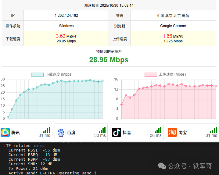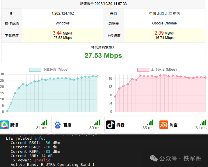 RSSI值为-56 dBm,下行速率为27.53 Mbps,上行速率为16.74 Mbps。 接下来,我们仅保留4G LTE天线1(靠近接地端子),再测试一下。