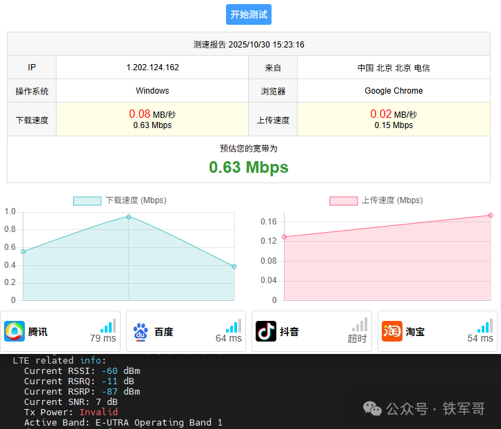可以看到,卫星信号全部丢失,但是显示的经纬度和高度还是之前一样,难道这个值是初始配置? 算了,不管了。在此场景下,GPS功能颇有英雄无用武之地的感慨,其实际作用确实相当有限。如果4G LTE天线故障或丢失,我们完全可以拿GPS天线顶上去,不用考虑GNSS的感受。 那如果很不幸,你只剩下一根天线了呢?这时只能接在4G LTE天线接口了,信号强度会怎么变化呢? 开始之前,我们先测试一下两根天线在位的信号强度和网络速率。