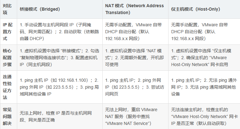 VMware 三种核心网络模式分别是桥接模式NAT 模式仅主机模式,核心差异在于虚拟机与主机、外部网络的连通性。
