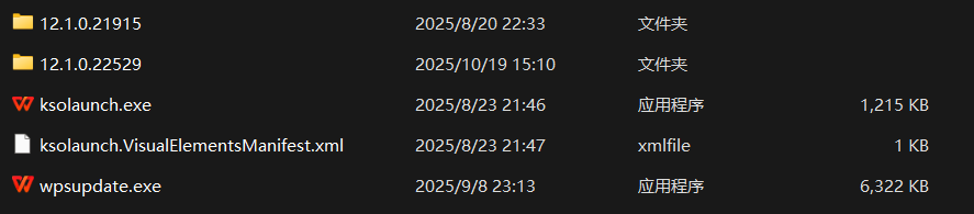 它们实际代表WPS Office不同版本的程序目录,WPS在版本更新时不会覆盖掉旧版本,而是新版本安装到新的文件夹;测试运行正常后,再切换快捷方式指向新目录;一段时间后(或下次更新时)自动清理旧版本。这样做有以下好处: