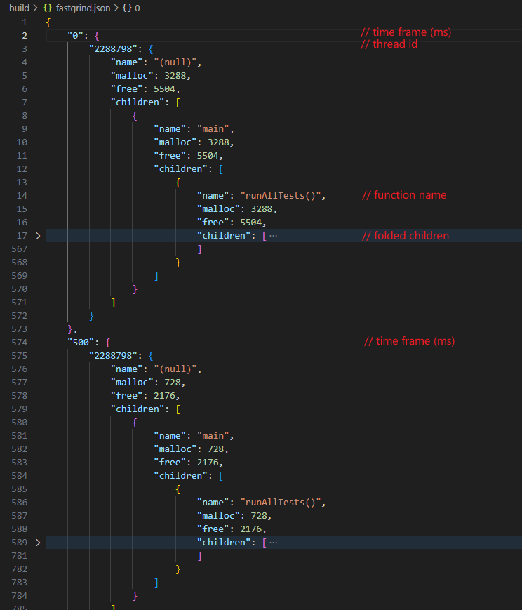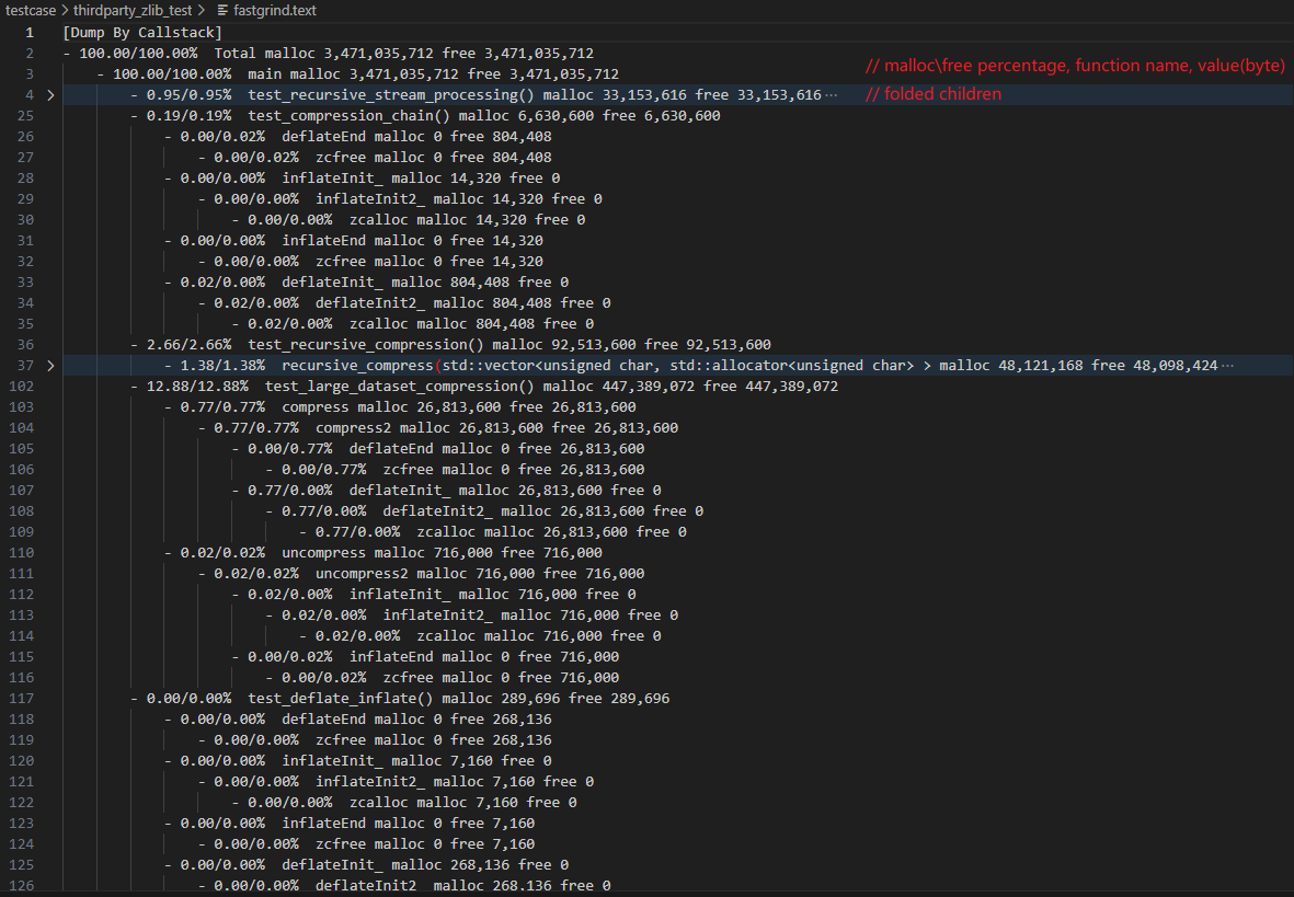 fastgrind.text 是类似于 Linux 下 perf report 格式的输出。有函数级别的调用栈内存申请/释放统计,在vscode等editor下可以进行子调用栈折叠。