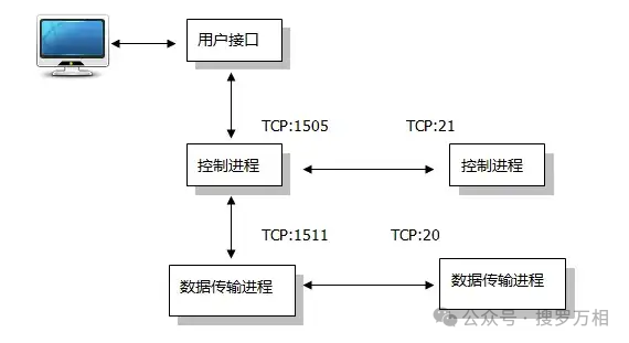 FTP基于TCP协议服务,默认使用20、21号两个端口,一个数据端口和一个命令端口,端口20是数据端口,用于文件在客户端和服务器之间传输数据流。端口21是命令端口,用于传输控制流,接受客户端发出的相关FTP命令与参数。
