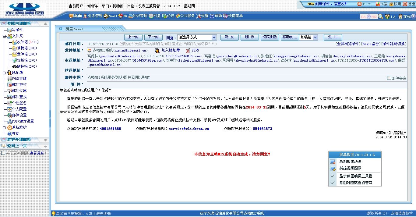 .│_&卜想(479996854) 9:58:19  OA系统点晴手机APP服务提示到期/过期/超期,该怎么办啊?  系统提示我到期,怎么办啊? 点晴客服  10:27:06 你们单位应该是申请了点晴手机APP试用服务,这项服务因为要占用我司服务器及带宽资源,不是免费的。这项手机APP服务与点晴OA是两个不同的体系,点晴OA是免费的,不需要依赖任何其他的程序就可以正常运行。 如果你们不再需要使用这项服务,那么可以在设置-》系统维护设置-》系统维护管理-》全局信息维护中,找到单位注册信息维护,将付费注册码清除,以后就不会再收到这个提醒邮件了。 如果需要继续使用,那么可以向我司在线客服咨询,或直接访问以下网址了解详情: 点晴MIS信息通手机APP客户端使用详细介绍: http://im.clicksun.cn/im/function_mb.htm 点晴MIS信息通PC客户端使用详细介绍: http://im.clicksun.cn/im/function.htm 该文章在 2015/11/19 9:08:29 编辑过 | 关键字查询 相关文章 正在查询... |